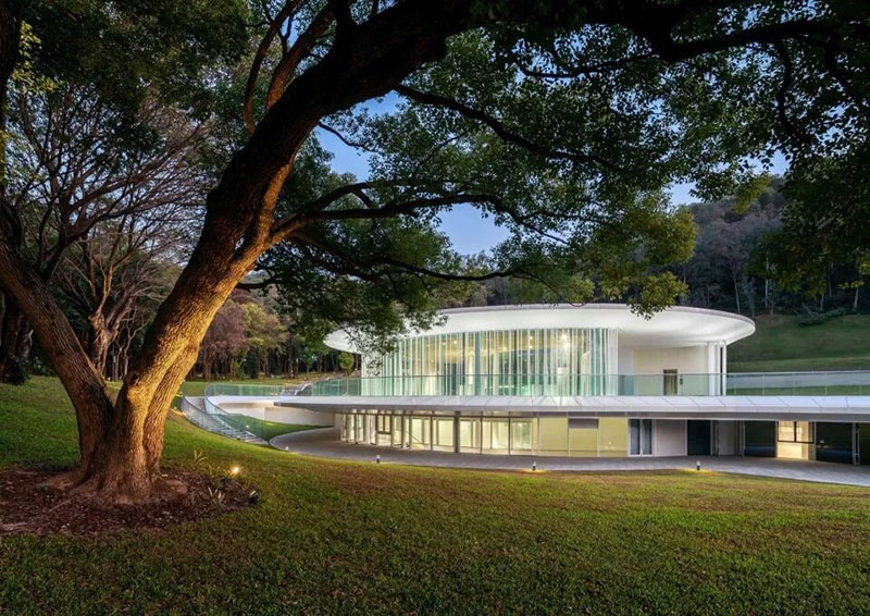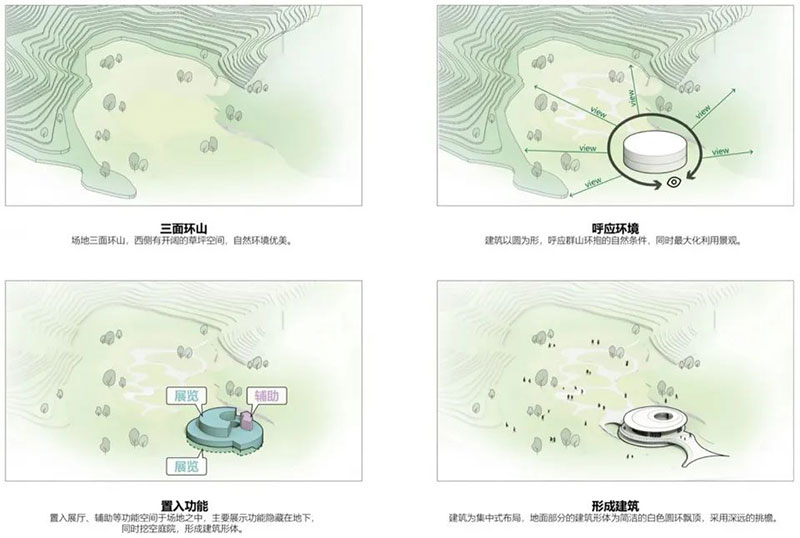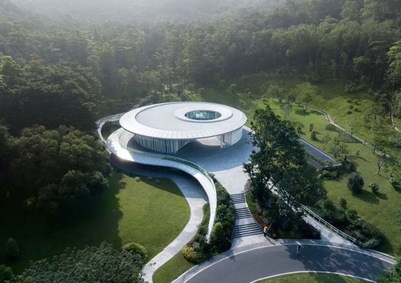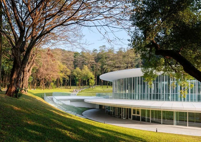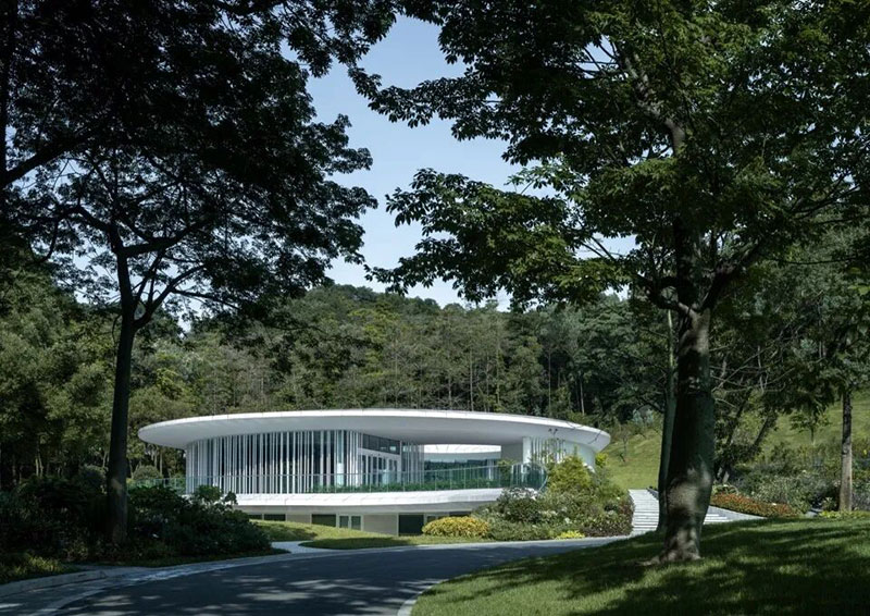 花城艺术馆建筑建筑凸显广州花城特色,造型灵感来自于古南越国国花“素馨花”,设计为白色圆弧形建筑,在凸显百花轻柔之美的同时,实现对周边优美风景的最大利用。场地三面环山,西侧有开阔的户外聚会草坪空间与保留的古香樟树。建筑为保持园林化的尺度,避免对周边环境造成压迫,采用退让的姿态将主体功能隐藏于半地下,既衔接群山环抱的地形条件,又以集中式圆形的建筑形态与香樟树对话,与树木共同组成优美的画面与焦点。