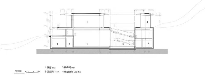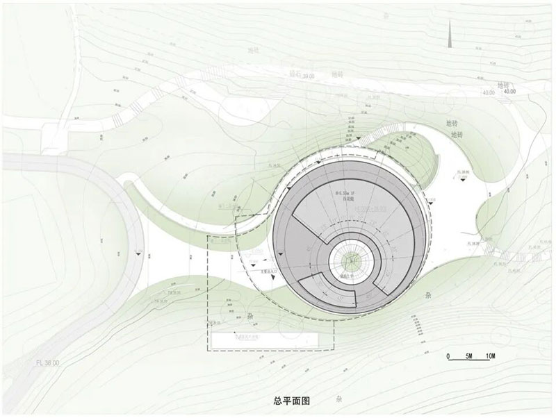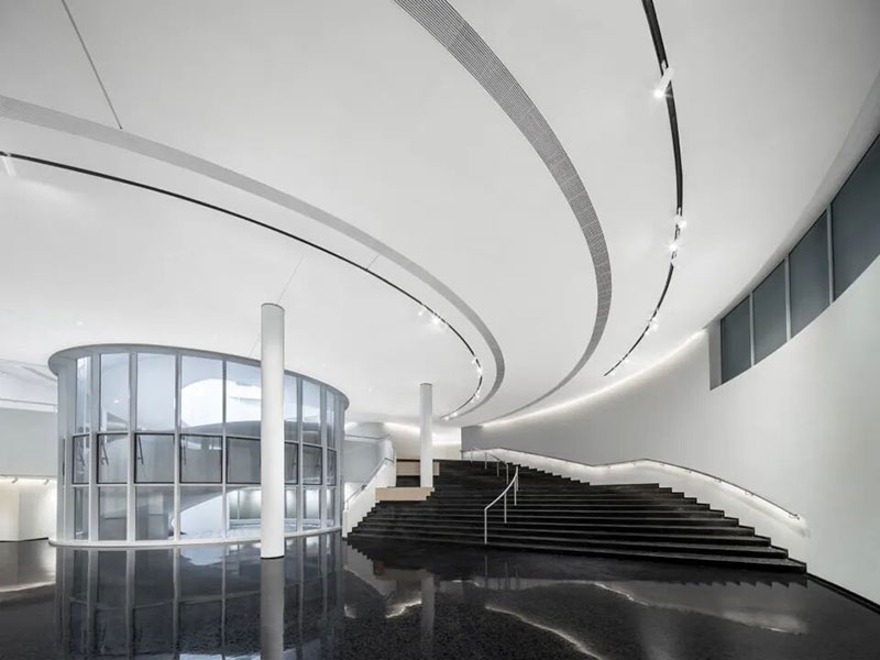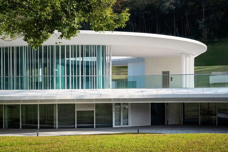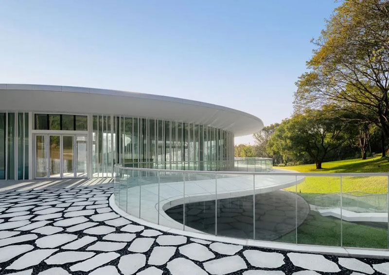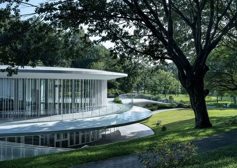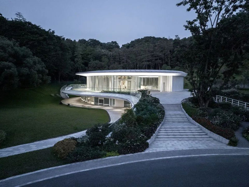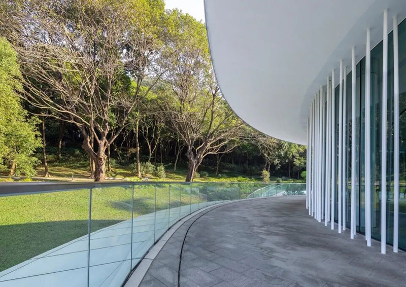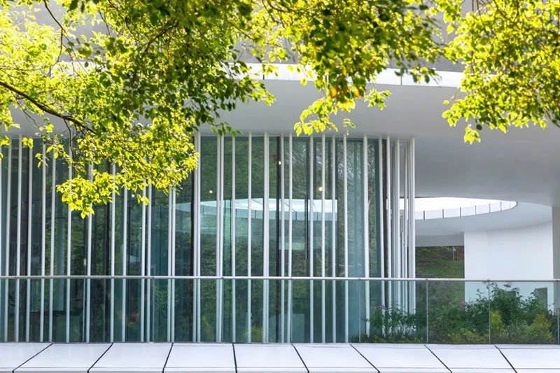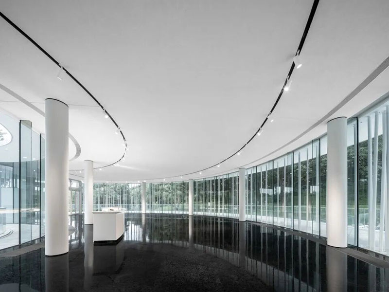 建筑轻盈漂浮于场地之中,采用水平向轻柔的曲线与场地相接,呈现出轻柔平静的状态,体现出建筑的静态美。