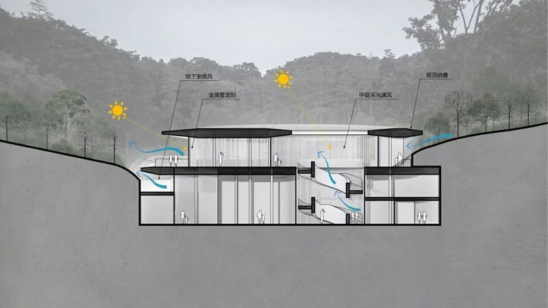 项目采用多项适应岭南气候的被动式节能手段:建筑整体采用半地埋式布局减少空调能耗;屋顶采用深远的挑檐,结合立面垂直白色的圆管遮阳,可减少立面太阳辐射热量;下沉小庭院在为室内补充自然光的同时,起到类似岭南建筑天井拔风的作用,有利于地下展馆的空气调节。