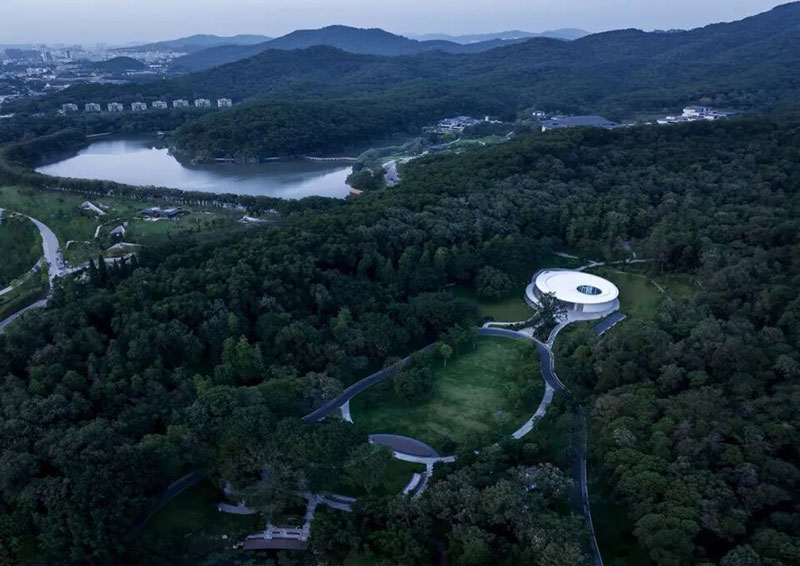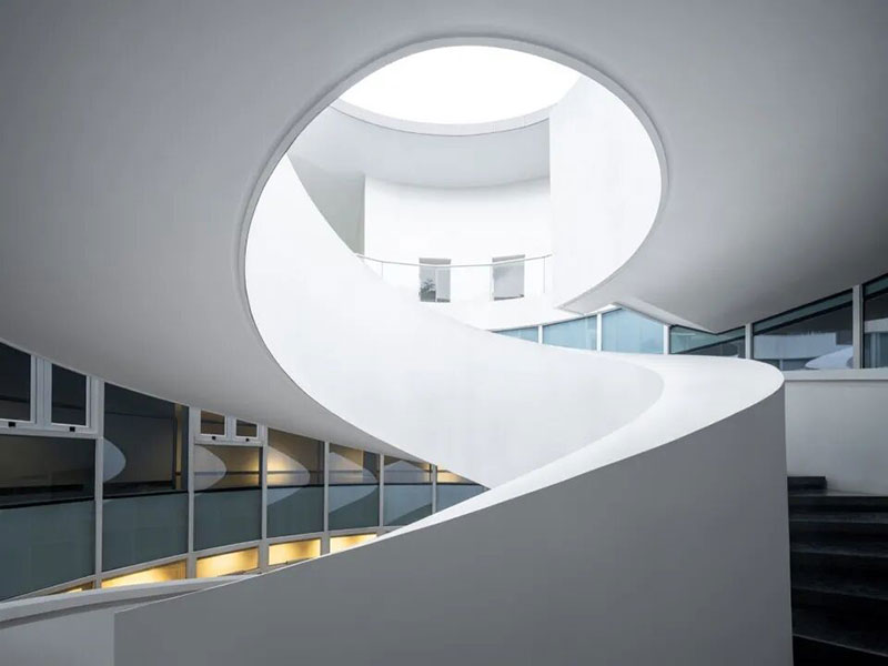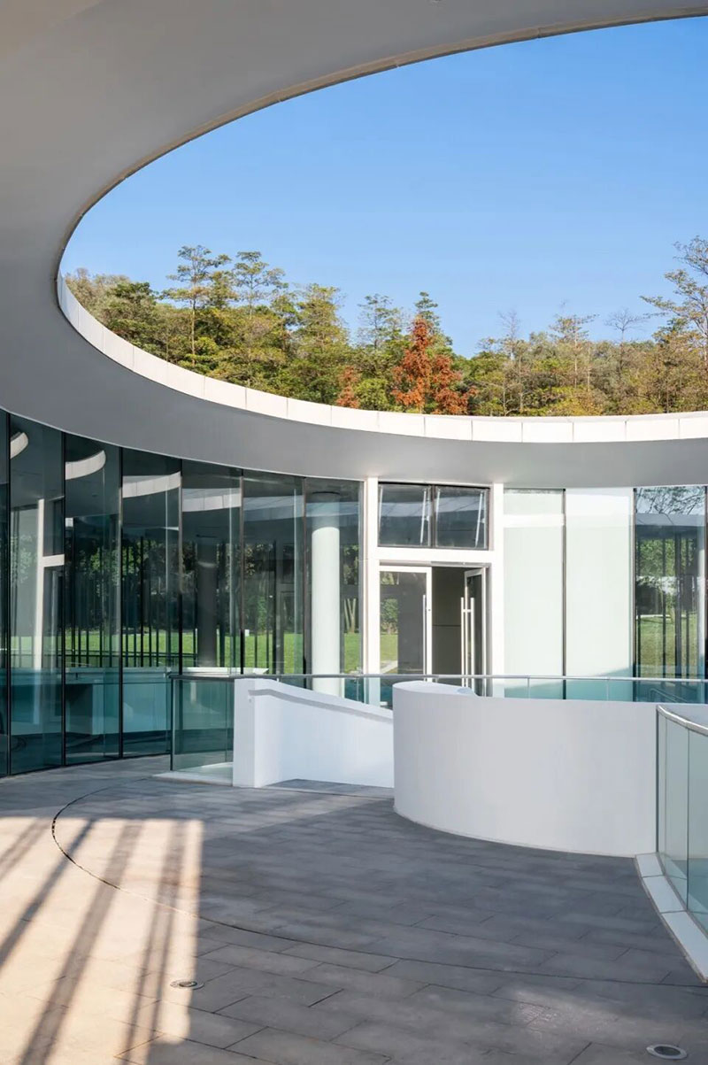 项目中庭自然形成一个圆形,与山景形成框景的关系,游客置身其中可感受到自然的山与天空的联系。中庭楼梯采用无柱结构,自上而下形成一个富有力量巨型的雕塑,与建筑轻柔之美形成一种强有力的对比。