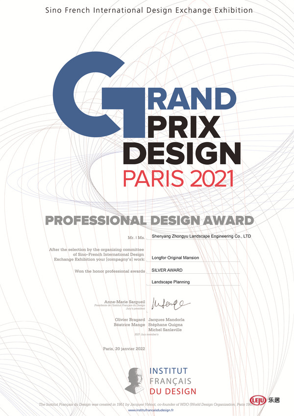 沈阳中裕景观工程有限公司作品《龙湖·双珑原著》从全球众多参赛作品中脱颖而出,荣获「2021第八届法国双面神“GPDP AWARD”国际设计奖-景观规划设计类银奖」。