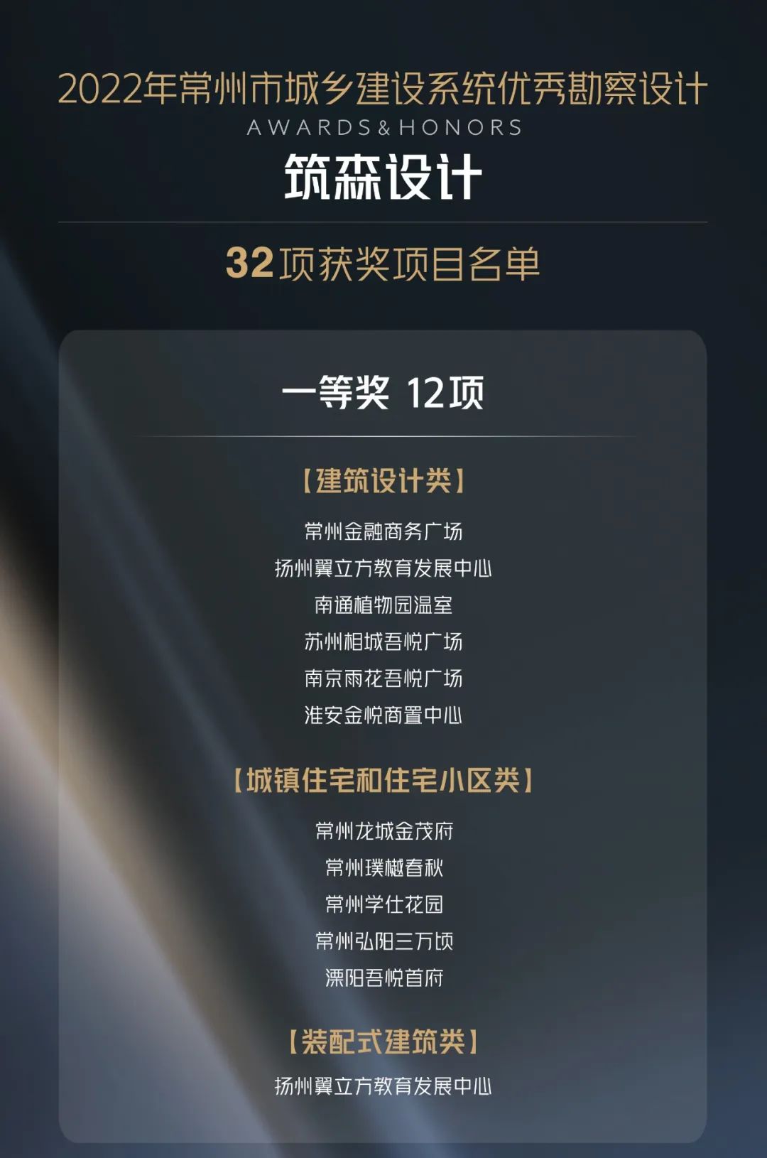 筑森设计在2022年度常州市城乡建设系统优秀勘察设计评选中荣获32项奖项。其中建筑设计类一等奖占据半壁江山,获得12项中的6项,并获得6个二等奖及4个三等奖;城镇住宅和住宅小区类囊括全部5个一等奖,并获得4个二等奖及5个三等奖;装配式建筑类囊括一、二等奖各1个。