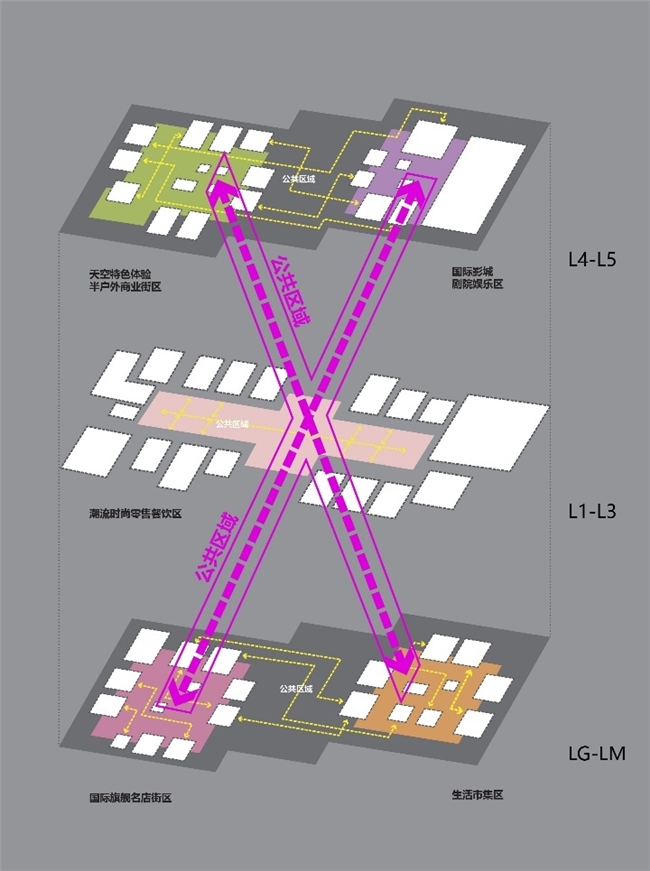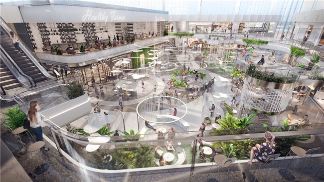 “棱镜拱廊”位于 “金星”三层通高穹顶下,成为高区标志性的视觉焦点与体验核心。双层通透的主力店以轻盈悬浮的“水晶盒子”形态呈现,与屋顶开放花园交融,模糊室内外边界。这一设计强化空间层次与多视角展示,融合商业、自然与未来感,打造创新的消费体验先锋场域。