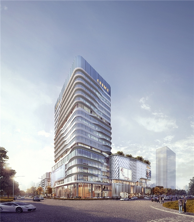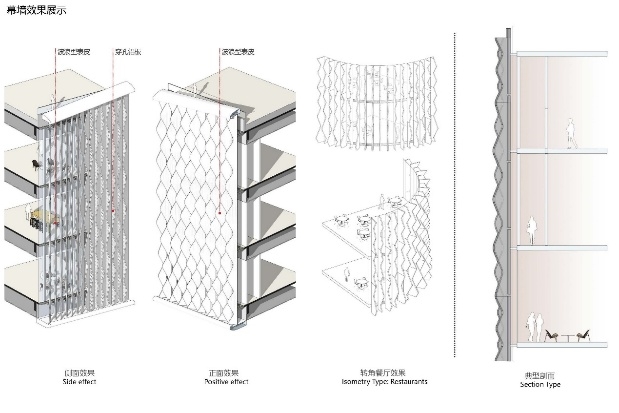 裙房立面设计以“科技云CLOUD”为主题,践行“步移景换”的设计理念。底部设计主力店铺盒子,上部以龙鳞状幻彩板与玻璃幕墙拼接,并有机融合LED媒体。随着行走路线与视角变化,立面图案、色彩及光影如流动幕布般实时变换,呈现动态视觉效果。