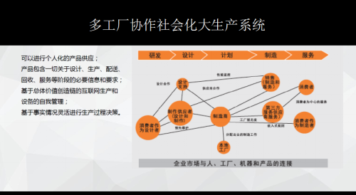 产品的全生命周期管理,保证各环节的数据与应用能够被所有项目供应者共享和使用,正确的信息在正确时间交给正确的人,然后做一个正确的动作。这是一个工业4.0的生产系统,它可以做到完全无人操作,这是我们现在配置的最高等级的工厂。这是一个模拟图,多工厂的协作社会化大生产系统,每一个工厂是全程数字化的,可以通过整个云系统的数据,让每一个工厂订单的分配和设备生产效率达到最大化。这样我们就可以从消费者、设计端到获客端往下导,不会出现饿死或者撑死的局面,饿死是没活干,撑死是接了订单不能消化,利用这种多工厂协作系统就可以解决这个问题。